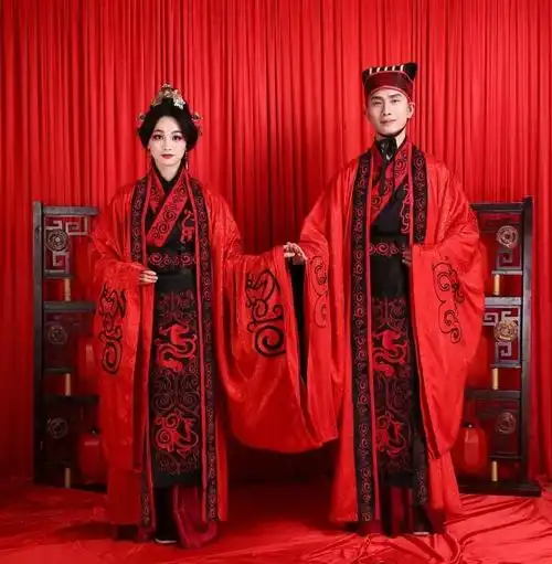 The history of ancient Chinese wedding attire can be traced back thousands of years. Starting from the Zhou Dynasty, wedding attire gradually became standardized. During the Zhou Dynasty, wedding attire was simple and solemn, and the color of the bride’s and groom’s wedding clothes was usually black or dark-colored, which was closely related to the background of the Zhou Dynasty’s reverence for black.