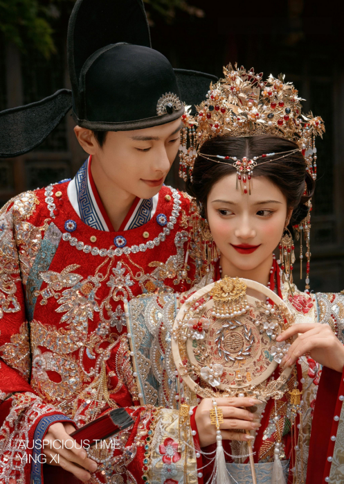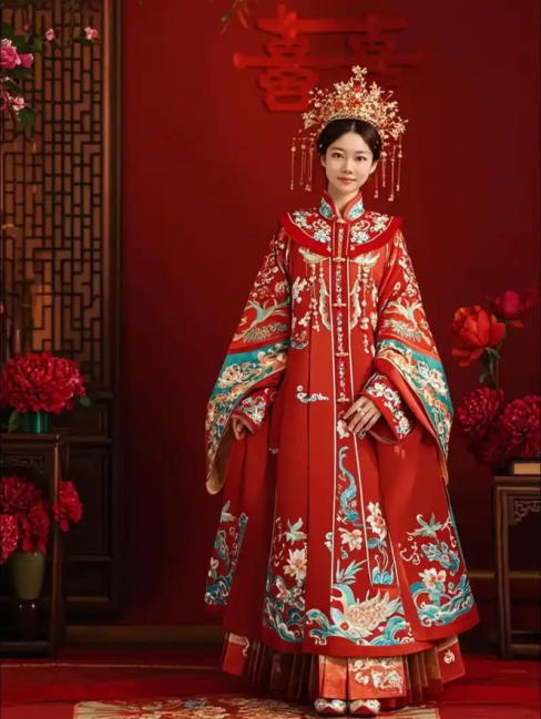 In the Song Dynasty, the style of wedding attire tended to be simple, with an emphasis on etiquette and norms. There were fewer decorative elements, and the attire was mainly red and green, following the tradition of “the groom in red and the bride in green”. The style focused on elegance. The wedding attire of the Ming and Qing Dynasties was basically finalized. Brides often wore “phoenix coronets and cloud-patterned shawls” (fengguan xiapi), and red became the fixed color of wedding attire, symbolizing joy and auspiciousness.