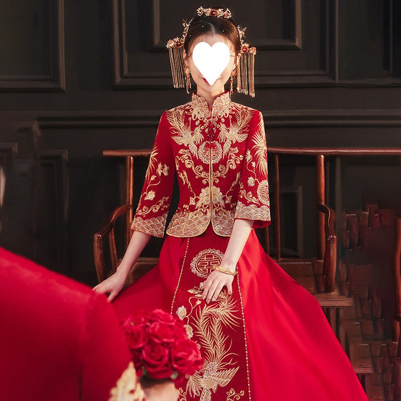 This wedding cheongsam is also called qipao or china dress. The dress in the picture is bright red. Red means happiness and good luck in Chinese culture. It has beautiful gold embroidery with phoenix and flower designs. These details make the dress look very elegant.