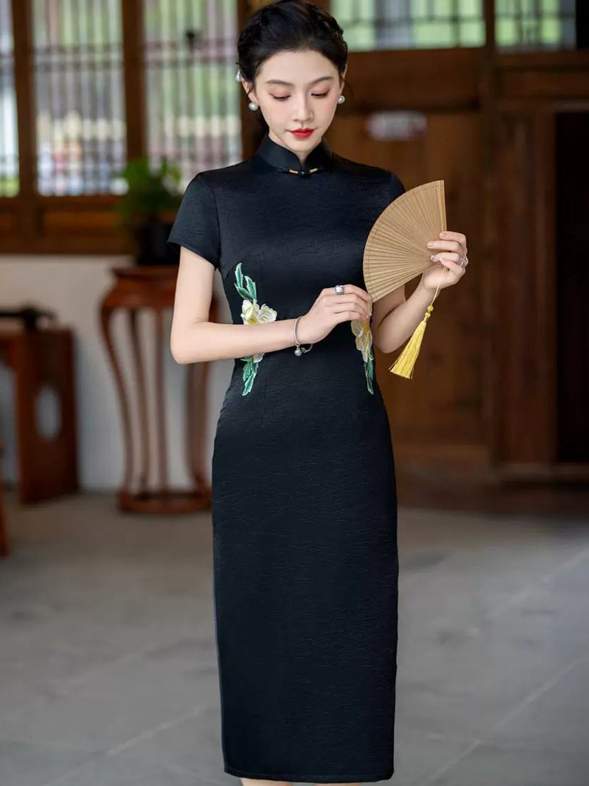 Discover the latest 2025 traditional Chinese dress! This black embroidered qipao features exquisite floral patterns, a classic stand collar, and subtle low slit for modern comfort. Perfect for daily wear or special occasions – shop now!