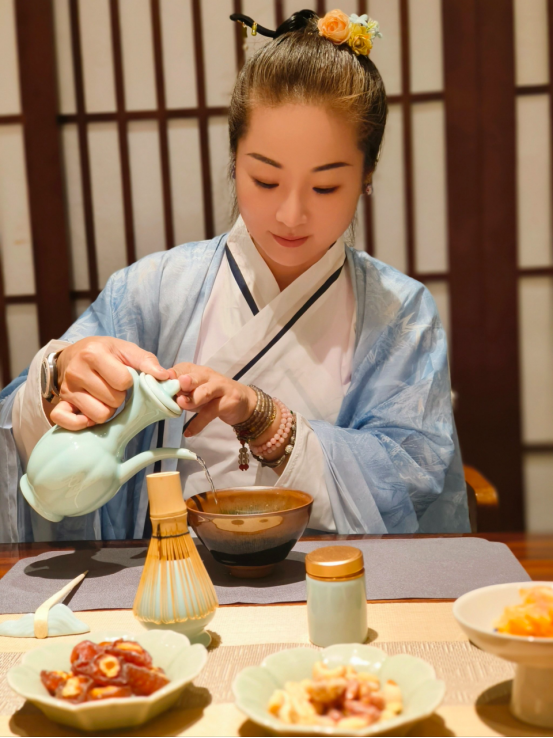 Hanfu tea ceremony etiquette is also quite elaborate. In the Song Dynasty, when preparing tea, one must keep wide sleeves from touching tea sets. In the Ming Dynasty, when serving tea, the back of the curved skirt should spread out like a lotus flower.