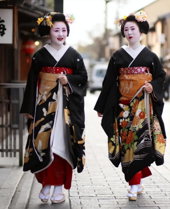 Their kimonos feature red-patterned collars. Over time, they transition to all-white designs as their seniority grows.