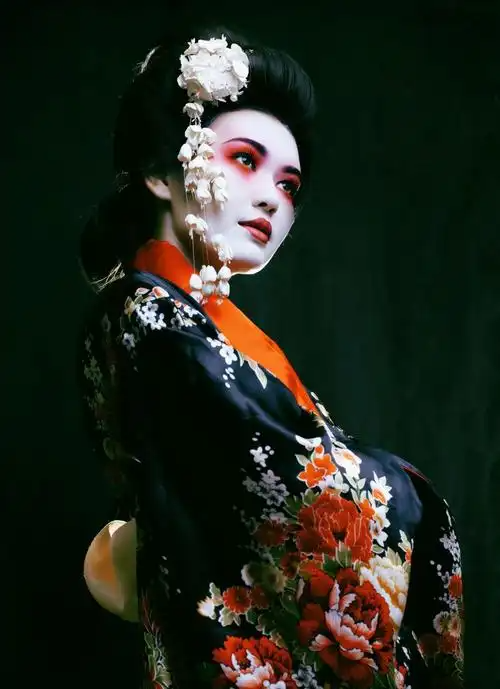 Geisha clothing use premium shiozzen silk (top-grade spun silk), adorned with intricate techniques like Kyo-yuzen dyeing or gold-leaf embroidery. Motifs include auspicious symbols (phoenixes, cherry blossoms) in bold hues (crimson, royal blue). High-rank geishas sport all-white trimmings. Everyday kimonos rely on cotton, linen, or synthetic fabrics with simpler patterns (small floral prints) in muted tones. Married women often wear dark furisode sleeves. - Style & Accessories