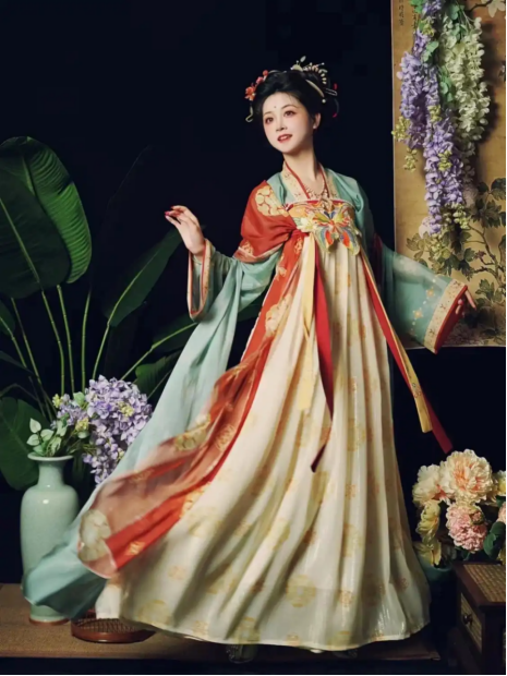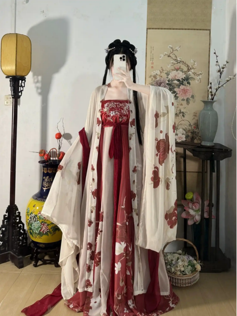 The robe body will have appropriately increased extra room in the bust and waist, expanding the cutting space in these areas. It also uses layered fabric stacking. This treatment not only modifies the body shape but also maintains the flowing quality of Hanfu.
